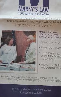 Kathleen Wrigley (you’ve heard of her, right?) has a big old grin on her face in a full page ad in North Dakota daily newspapers this past Sunday showing her presenting petition signatures to Secretary of State Al Jaeger to put a constitutional amendment called Marsy’s Law on the ballot this November.