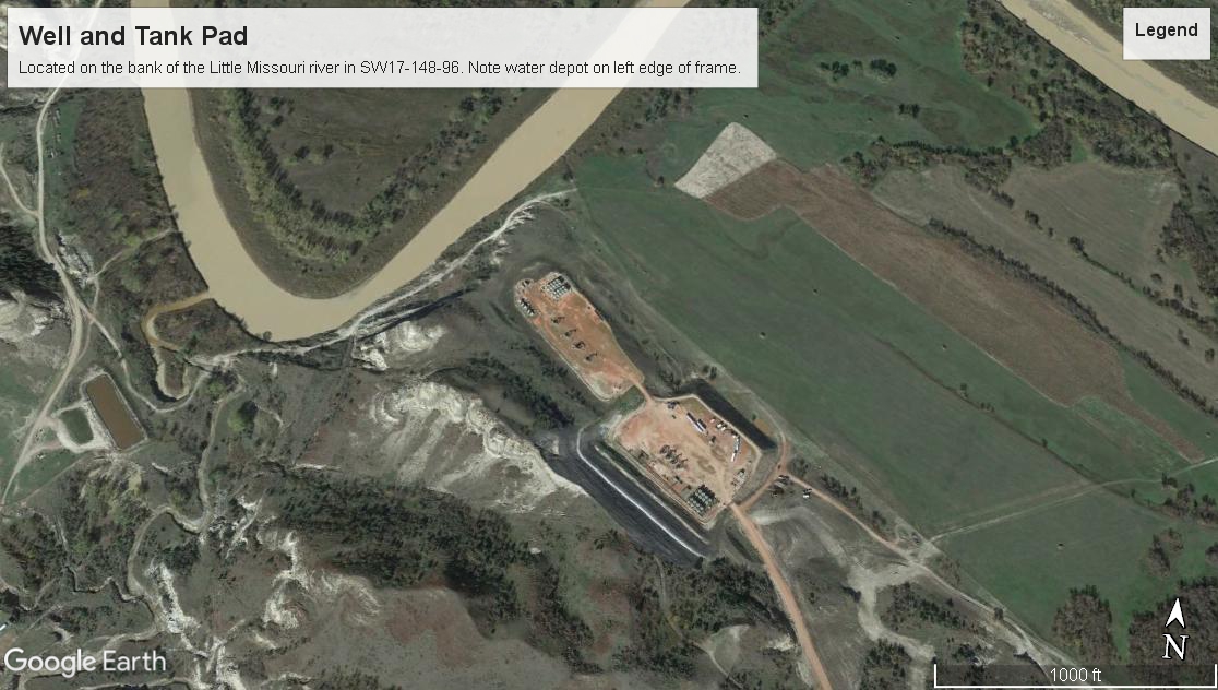 I’m posting a few pictures with this story that I made by scanning the Little Missouri Scenic River valley on Google Earth. Take a look at them. They show what’s been going on the last few years as a result of the State Engineer issuing illegal water permits, and the absence of oversight by the Little Missouri Scenic River Commission during the Hoeven and Dalrymple administrations. Take a look at the well pads and water depots just yards from the state’s only officially designated State Scenic River. This is what needs to stop. I really hope the Little Missouri Scenic River Commission will step in and do what the law that created it allows them to do. Here’s that law:
