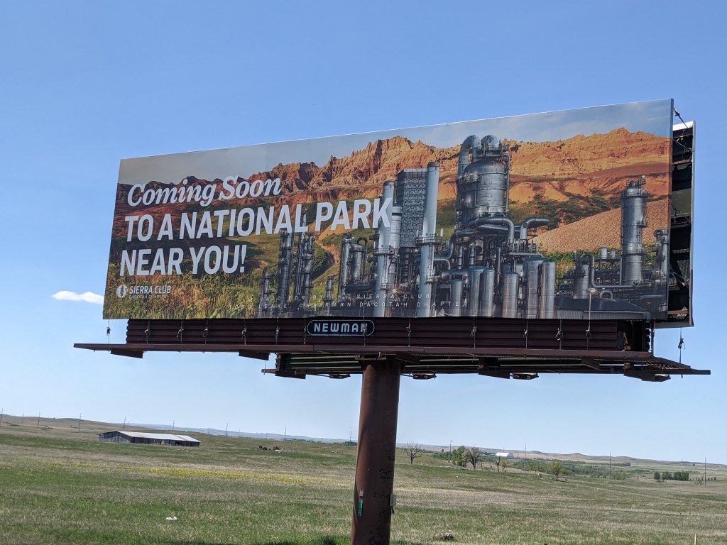 They say a picture is worth a thousand words. Yep. This one, put up just west of Mandan, North Dakota, en route to the Bad Lands, is the work of North Dakota’s Sierra Club organizer, Wayde Schafer. No more words needed.