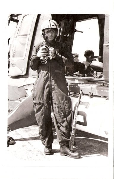 PH2 Fuglie on the flight deck of the USS Oriskany, getting ready for a helicopter ride.