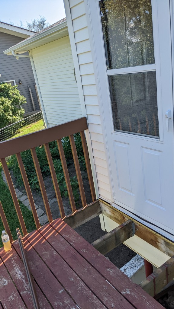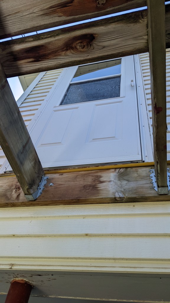 Dave is a good carpenter, and Darrell had brought him over to the Highland Acres house to replace the old boards on the floor of the deck this past weekend. Dave and his partner had pulled some of the boards off, and were ready to replace them, when they decided to take a lunch break. As they left for lunch, Dave’s last words to Darrell and Kathy were “Don’t go out the back door.”