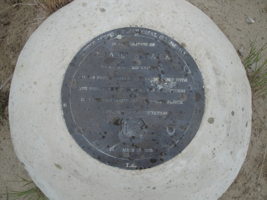 Conservation organizations placed a marker honoring Boone and Crockett President Lowell Baier on the bluff overlooking the Little Missouri River on what is now the Elkhorn Ranchlands. It’s a bit weathered now. It reads: