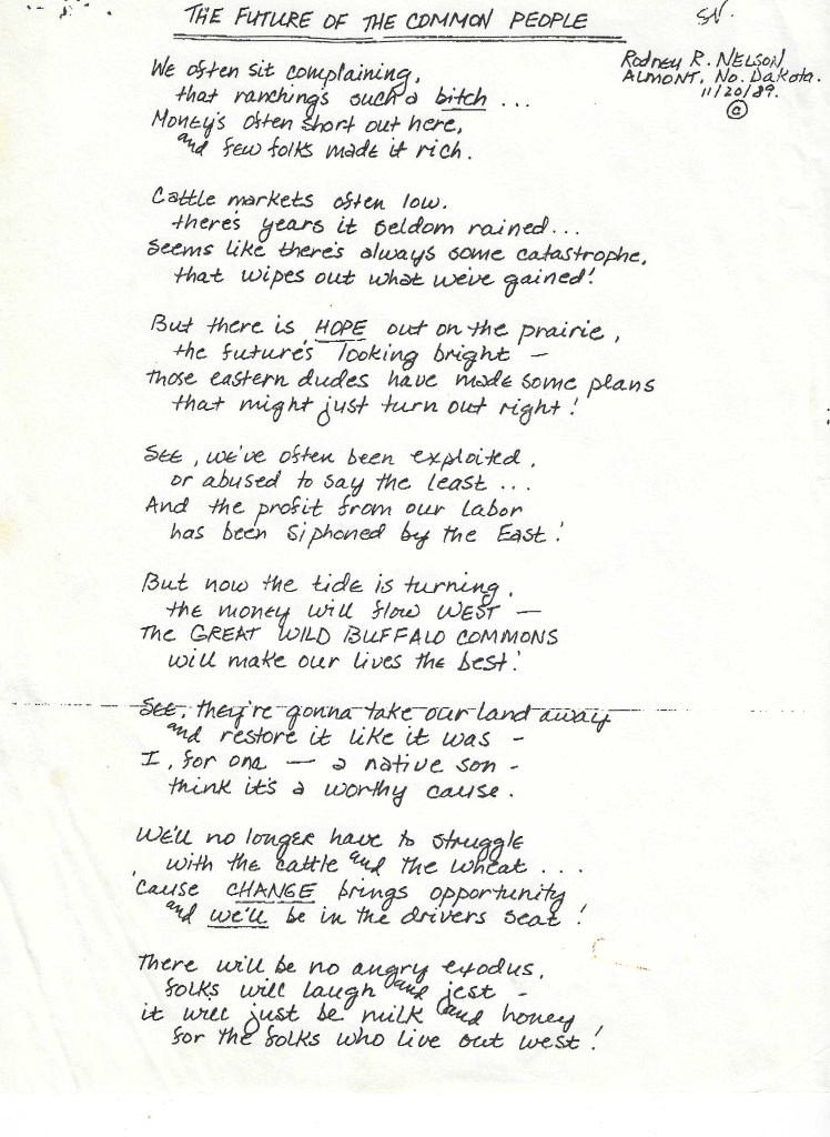 Meanwhile, back at the ranch . . . Rodney Nelson’s ranch, that is . . . I’m going to share something else with you. While I was paging through the magazines, sorting out which ones I’m going to keep, because they had something in them that I was interested in (I’m too old to read all of them in the years I have left, I expect), I came across three sheets of yelllowed paper tucked into one of them. I lifted them out carefully, and there, in his own hand, was a poem about the days of Buffalo Commons (remember that?) by Morton County rancher Rodney Nelson, and old friend of mine who passed away a few years ago. I’m not sure how my neighbor came across that, but it’s now a prized possession of mine.