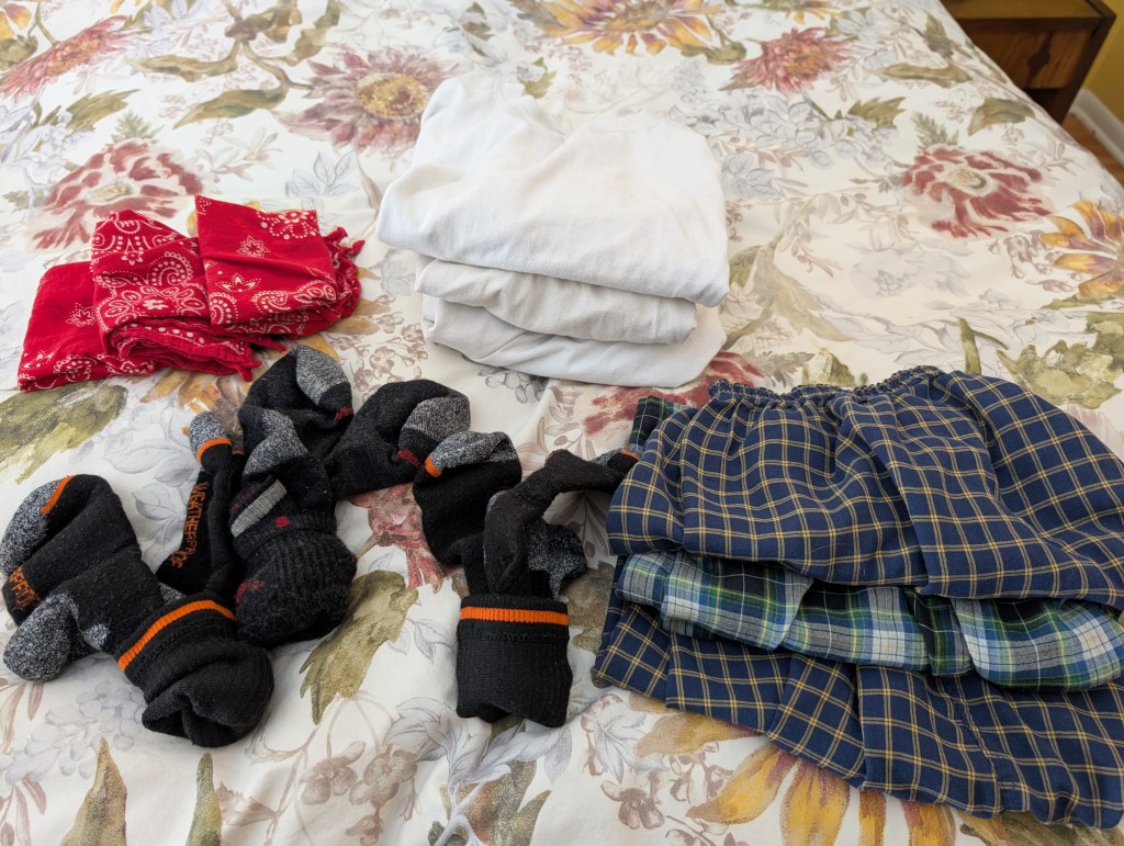 This morning I was folding Monday Morning Laundry, and after I had put away her clothes, and the towels and the sheets and the napkins, and the “hang-up” clothes, I looked down at the bed, and saw this amazing symmetry. T-shirts, socks, underwear and handkerchiefs. Three of each.