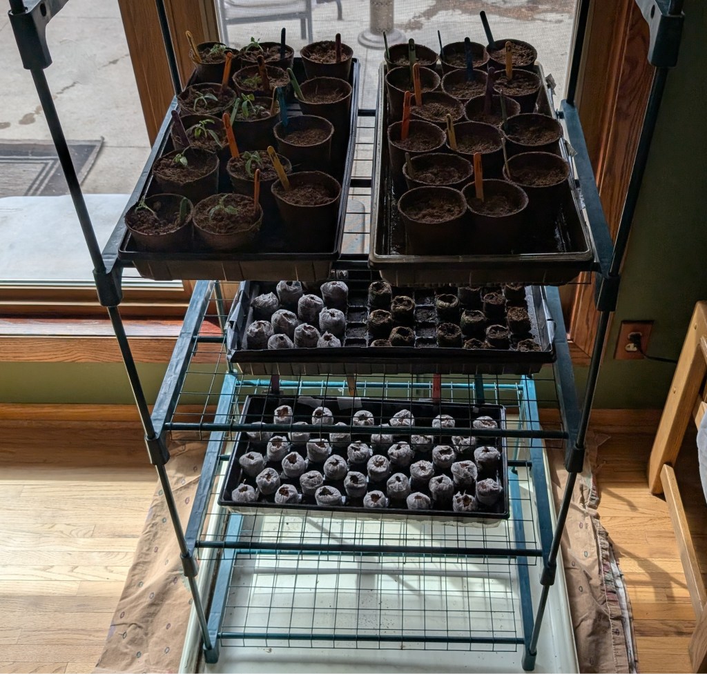 Well, it was the disaster on Friday night, March 28, 2025, that finally helped me figure out what was going on this Spring. See, I’ve had pretty good luck with starting tomatoes down there. I often start up to a hundred little peat pellets with half a dozen or more varieties of seeds I get from a California company called Tomatofest, the best seeds in America, I think. Every year they ALL sprout, and I raise them up to transplant size, putting around 25 or 30 in the ground in my garden and giving the rest away to friends who like tomatoes.