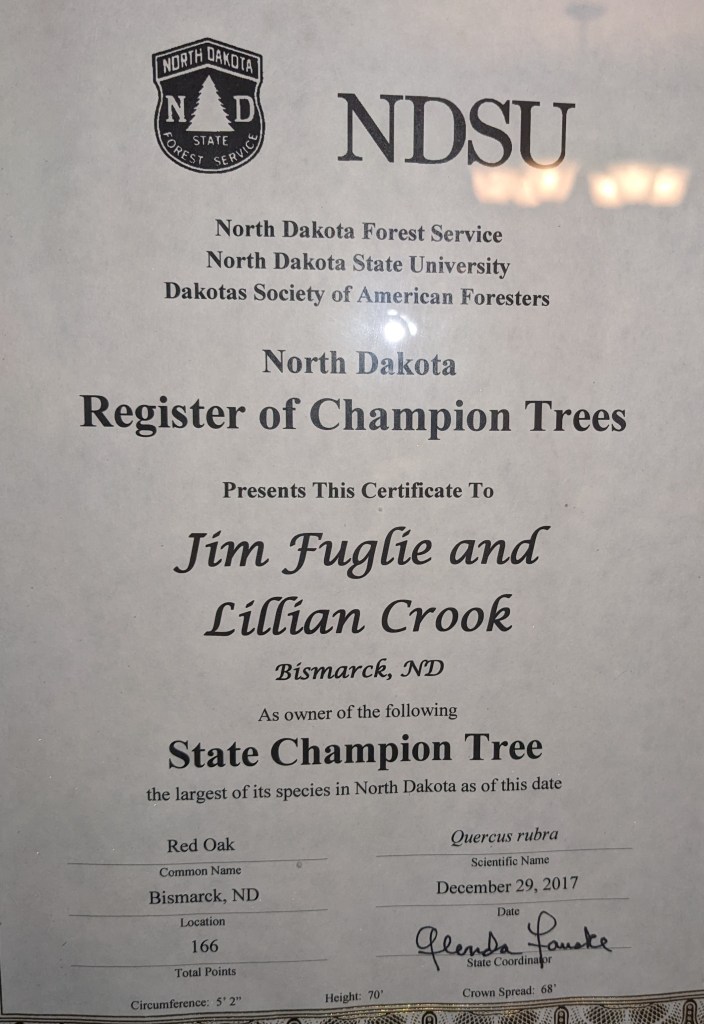 Well, on December 29, 2017, we received a certificate in the mail from Glenda Fauske, State Coordinator for the North Dakota Register of Champion Trees, declaring the giant Red Oak tree (Quercus rubra) in our front yard as a State Champion Tree. The largest Red Oak tree in North Dakota.